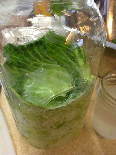 Once you have a nice juicy mess, you need to start packing the cabbage down tightly into your vessel. I used large mouth Ball jars. (I splurged on a 1 gallon crock but haven't ventured that far yet!) My latest purchase was a set of special lids with airlocks. The airlock means I no longer have to remember to "burp" the jar to release the gases. Pack all the cabbage down to get rid of air pockets - they will allow for aerobic fermentation which is NOT what you want! - and until the brine (liquid) level is above the level of the cabbage.